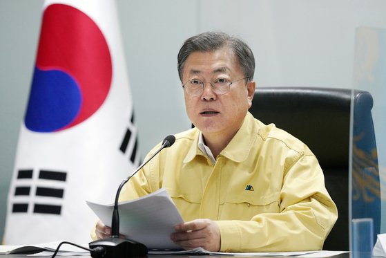 문재인 대통령이 7일 오전 청와대 국가위기관리센터에서 코로나19 중앙재난안전대책본부 회의를 주재하고 있다. [사진제공=청와대]