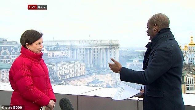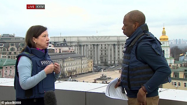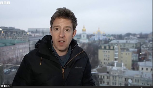 BBC reporters put on flak jackets after live broadcast from Kiev rooftop was interrupted by whirring air raid sirens... warning MORE of Putin's devastating missiles were screaming towards city