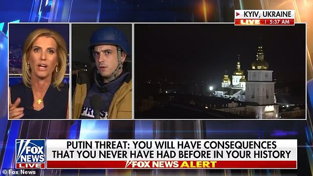 On the Fox News Channel, Laura Ingraham was reeling off various failed attempts at diplomacy while Fox News' Foreign Correspondent, Trey Yingst, could be seen wearing a protective helmet.