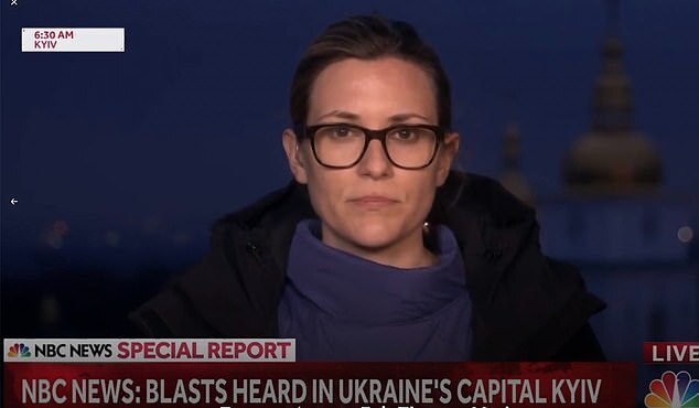 NBC News Senior National Correspondent Tom Llamas appeared on television screens and crossed to former CNN Correspondent Erin McLaughlin, pictured, who was live in Kiev