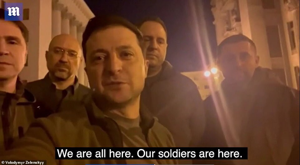 Zelensky and his aides, including the defense minister, Oleksiy Reznikov - behind Zelensky, with glasses - posted a video from Kyiv early on Friday morning, reassuring the people that he remained with them and had not fled, despite his life being in danger