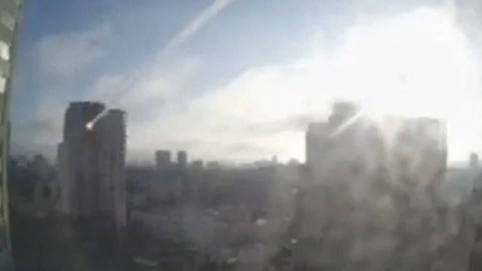 A huge explosion can be seen as the missile connects with the apartment building in the Ukrainian capital