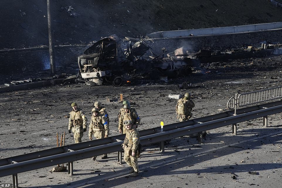 Ukrainian soldiers are pictured forming up across a highway in Kyiv as they prepare to defend the city from Russian attackers, with gunfire and explosions heard in the centre of the capital