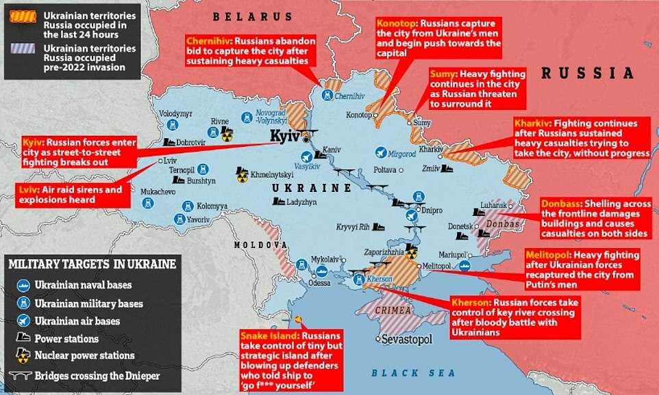 - Ukraine claimed that 14 Russian aircraft, eight helicopters, and 102 tanks had been seized. The scale of Ukrainian losses was not clear