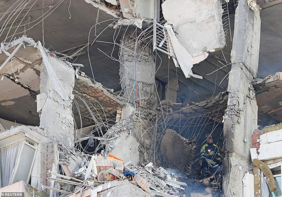 Emergency services said the number of victims from the attack in the Zhuliany district was 'being specified' and that an evacuation was underway. Images show the tower block with a hole covering at least five floors blasted into the side and rubble strewn across the street below.