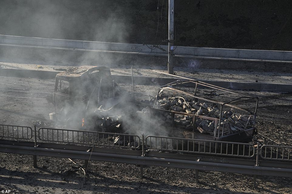 Debris of a burning military truck is seen on a street in Kyiv, Ukraine on Saturday morning as Russian troops stormed towards the capital