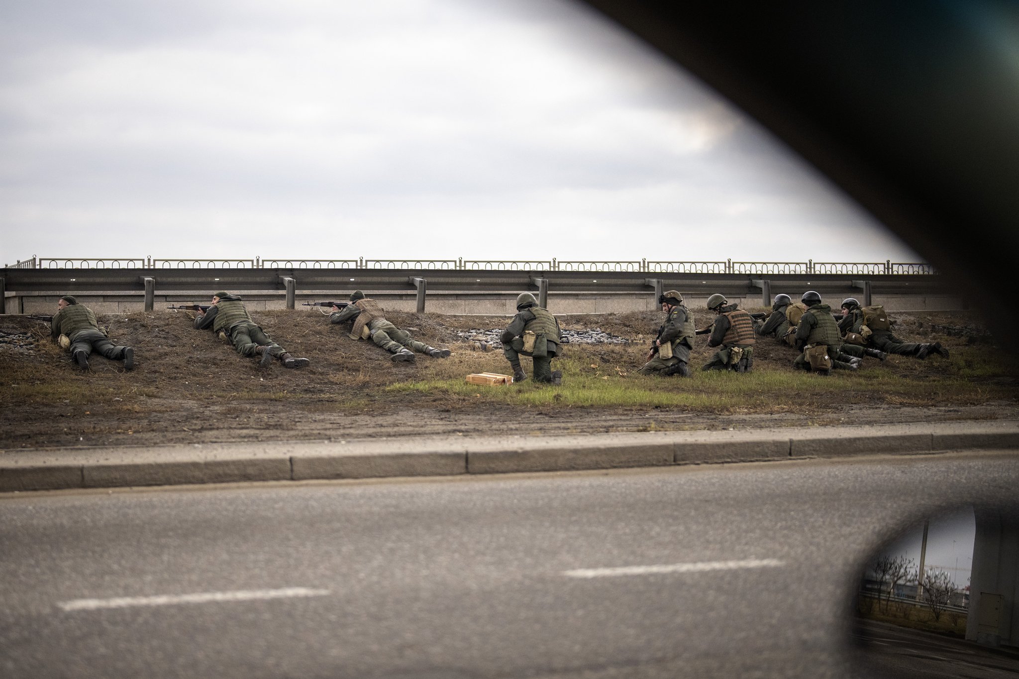 러시아의 우크라이나 침공 이틀째인 25일(현지시간) 우크라이나 군인들이 수도 키예프 시내 교량 아래서 러시아군의 공격에 대비하고 있다. [AP=연합뉴스]