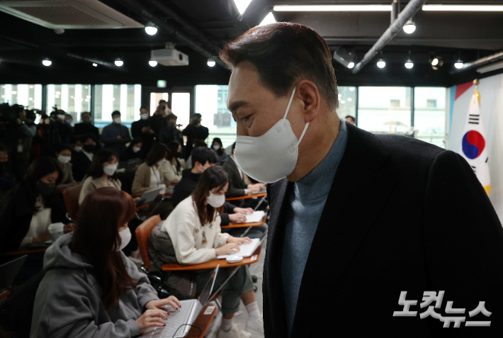 윤석열 국민의힘 대선 후보가 27일 오후 서울 여의도 중앙당사에서 안철수 국민의당 대선 후보와의 단일화 협상 관련 기자회견을 하기 위해 회견장에 들어서고 있다. 윤창원 기자