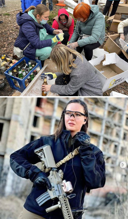 화염병 제조… 총 든 ‘미스 우크라이나’26일(현지 시간) 우크라이나 남부 드네프르시에서 교사 변호사 주부 등 시민들이 화염병을 만들고 있다(위쪽 사진). 2015년 ‘미스 우크라이나’로 선발됐던 아나스타시야 렌나는 22일 인스타그램에 총을 든 사진과 함께 “우크라이나를 건들지 말라”고 올렸다. BBC·인스타그램 캡처
