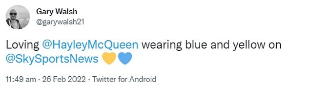 Support for McQueen continued to pour in as a third supporter penned: 'Loving @HayleyMcQueen wearing blue and yellow on@SkySportsNews'.
