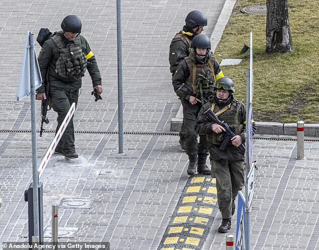 Ukrainian servicemen patrol during a curfew as Russian forces continue to advance on the third day of fighting around Kyiv
