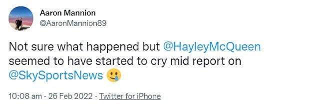 Another added: 'Not sure what happened but @HayleyMcQueen seemed to have started to cry mid report on @SkySportsNews'.