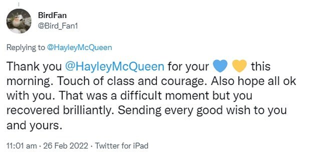 While a fourth wrote: 'Thank you @HayleyMcQueen for your' - followed by blue and yellow heart emojis - 'this morning. Touch of class and courage. Also hope all ok with you. That was a difficult moment but you recovered brilliantly. Sending every good wish to you and yours.'