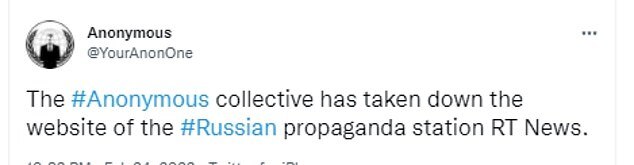 Anonymous said in their tweet about RT: 'The #Anonymous collective has taken down the website of the #Russian propaganda station RT News.'