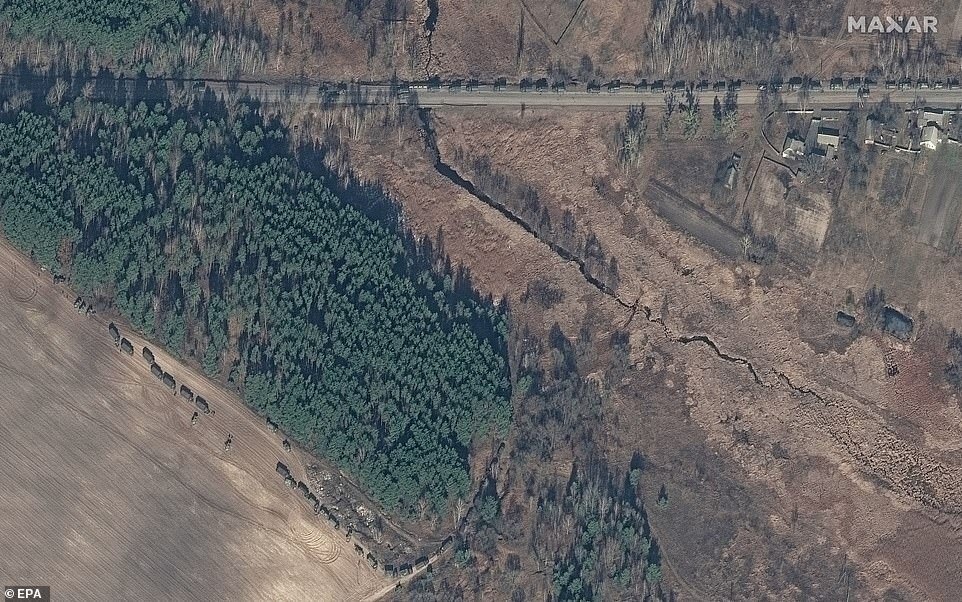 A huge column of Russian tanks and support vehicles is seen near Ivankiv, around 40 miles north of Kyiv, on Sunday. The column is now thought to be around 20 miles from the city