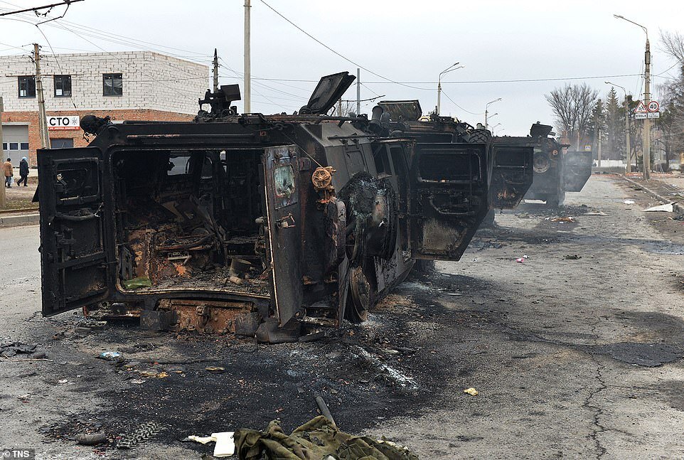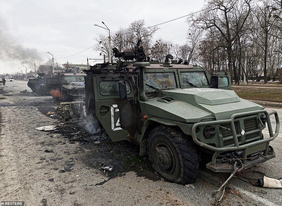 A view shows destroyed Russian Tigr-M infantry fighting vehciles on a road in Kharkiv, Ukraine