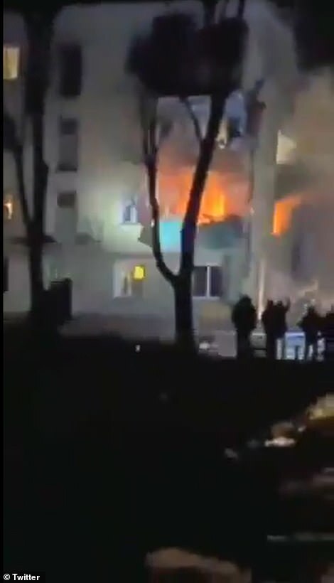 An apartment building is pictured on fire in Chernihiv, north of Kyiv, as Russian forces continue to try and reach the Ukrainian capital en masse so they can seize the city