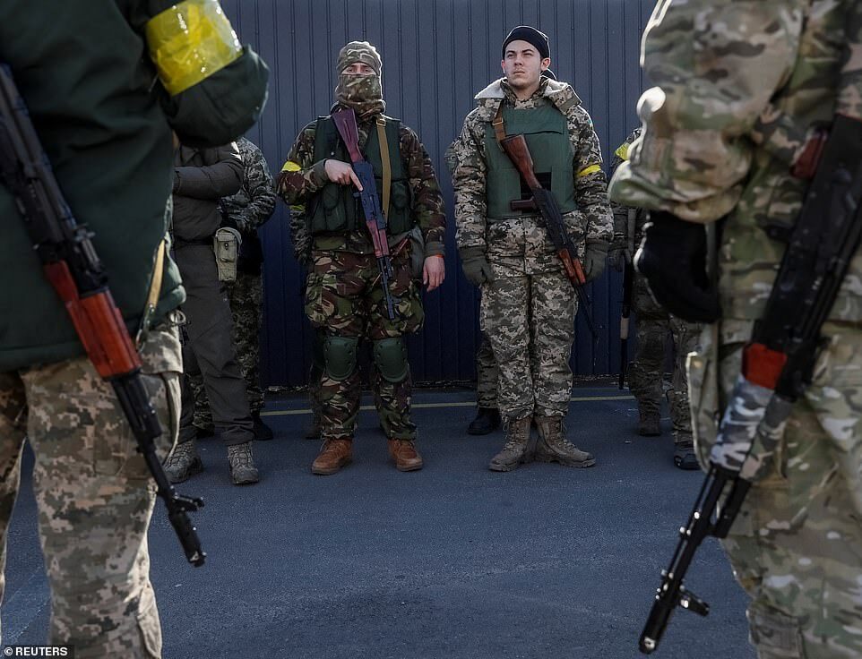 New members of the Ukrainian Territorial Defence Forces train with newly received weapons in Kyiv, Ukraine