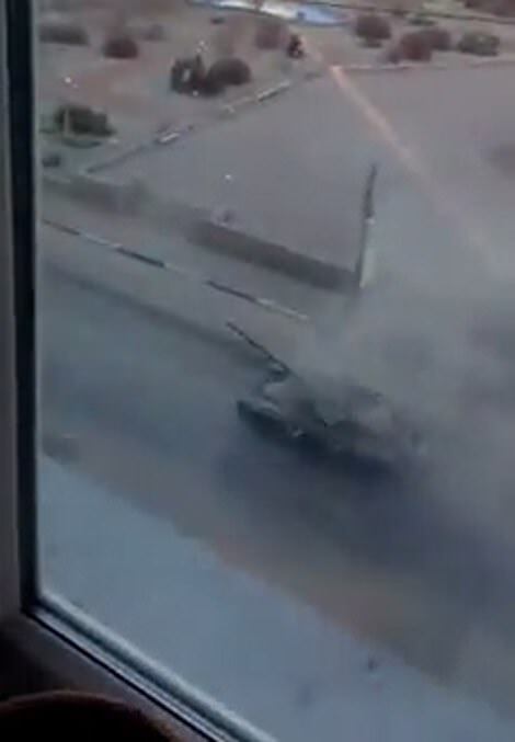 A Russian tank is pictured driving through Borodyanka, to the north-west of Kyiv, as Russian forces attempt to encircle the Ukrainian capital from the west