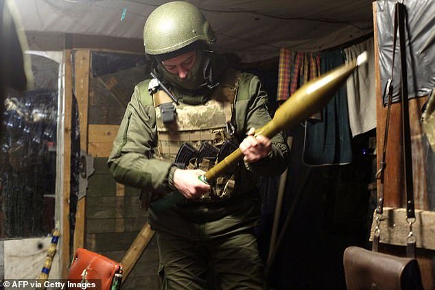 'Under martial law, Ukrainians with real combat experience will be released from custody and will be able to compensate for their guilt in the hottest spots of the conflict,' Zelensky said (pictured: a serviceman of Ukrainian Military Forces holds a hand grenade launcher on his position on the front line with Russia backed separatists, near Novognativka village, Donetsk)