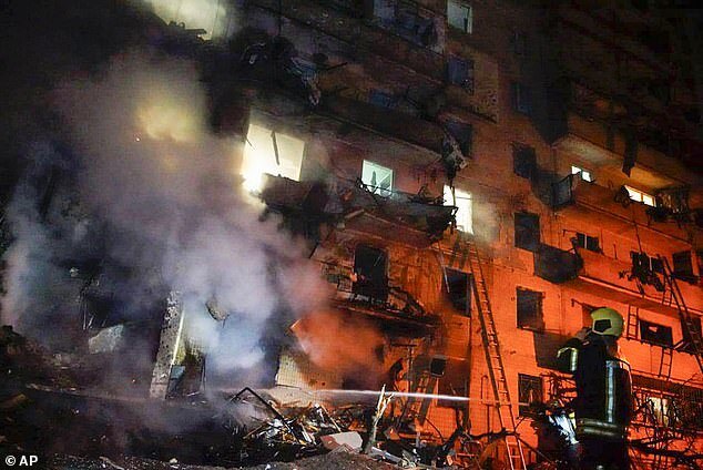 Firefighter inspects the damage at a building following a rocket attack on the city of Kyiv