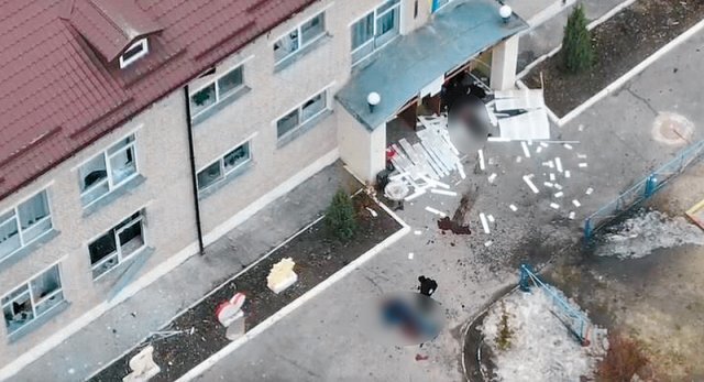 2월 25일(현지 시간) 러시아군이 발사한 집속탄 여러 발이 터진 우크라이나 동북부 수미주 오흐티르카의 한 유치원. 이로 인해 어린이 1명을 포함한 3명이 숨졌다고 국제인권단체 앰네스티가 27일 밝혔다. 트위터 영상 캡처