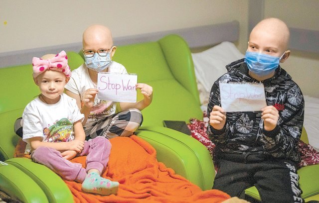28일(현지 시간) 우크라이나 수도 키예프의 병원 내 소아암 병동에서 투병을 위해 삭발한 어린이 환자들이 러시아의 침공을 규탄하며 ‘전쟁을 멈추라(Stop War)’고 쓴 종이를 들어 보이고 있다. 유치원, 학교 등 어린이가 밀집한 장소 또한 닥치는 대로 폭격하는 러시아군의 행태에 대한 비판 여론이 거세다. 키예프=AP 뉴시스