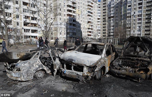 People walk past burned cars a day after a shelling on a residential area in the Ukrainian capital Kyiv. The country is enduring its fifth day of fighting after Russian invaded on Thursday