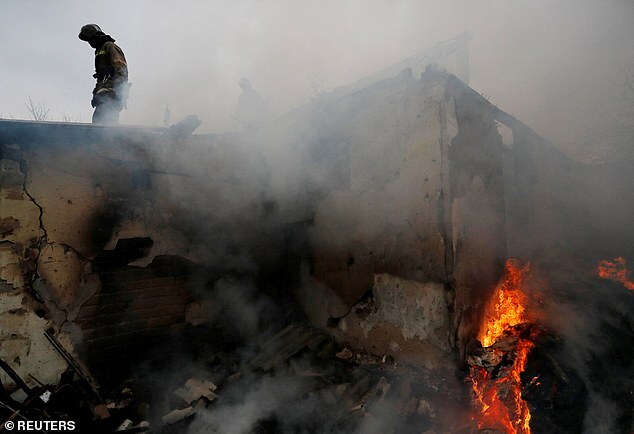 Firefighters tackle blaze at a house after recent shelling, in the separatist-controlled city of Donetsk, Ukraine, as the conflict rages into its fifth day