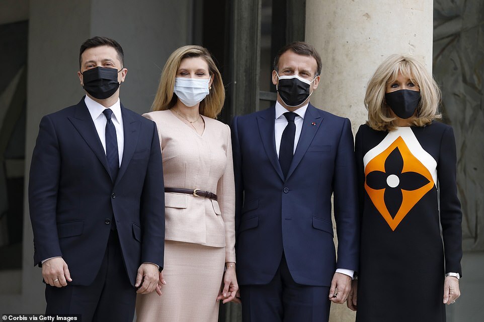 Perfectly poised: Olena and Zelensky (left) with President Macron of France and his wife Brigitte in April 2021
