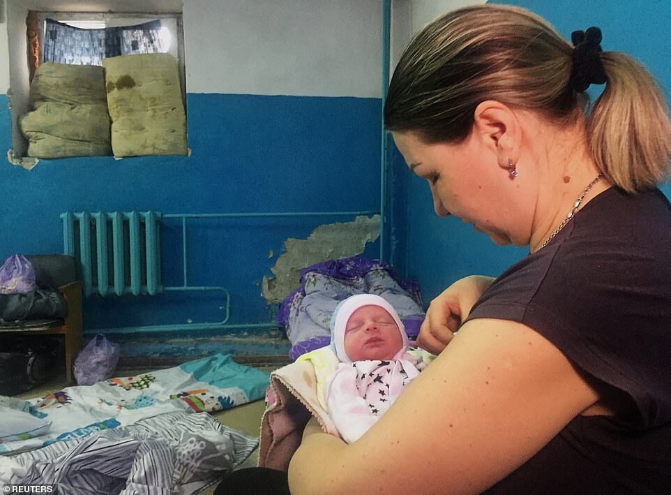 The hail of bombs, shells and rockets which began falling at lunchtime left at least nine dead, including three children according to local officials, with homes and even a school reduced to rubble. Above: A woman sheltering in Kharkiv holds her newborn baby