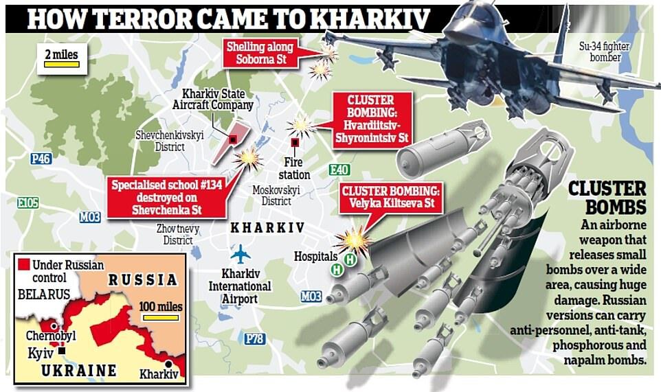 Kharkiv, Ukraine's second city, came under heavy bombardment from indiscriminate Russian artillery and may have been hit by so-called 'cluster' munitions, causing 'dozens' of casualties