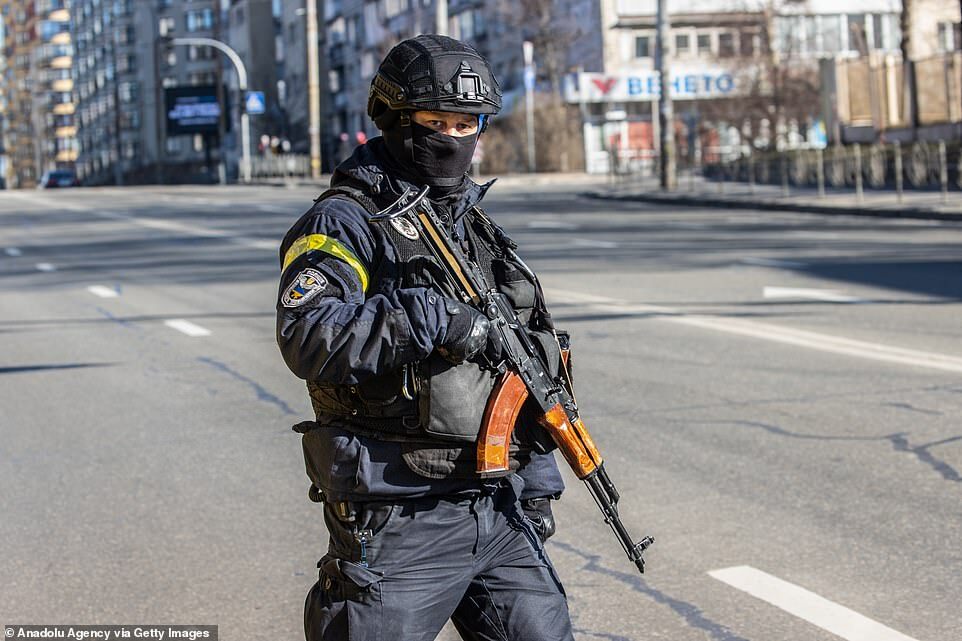 An armed Ukrainian guard is seen on the streets of Kyiv on Monday morning as security is stepped up amid fears of more-frequent and bloodier Russian attacks