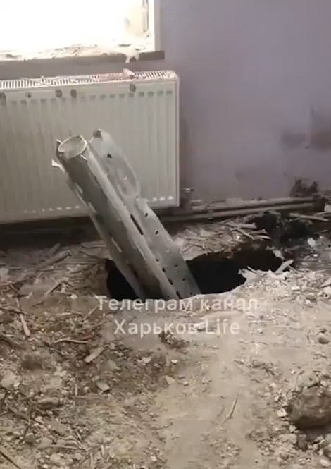 A spent Russian rocket is seen embedded in the floor of an apartment building in Kharkiv, eastern Ukraine, after Putin's forces unleashed a bombardment against civilian areas