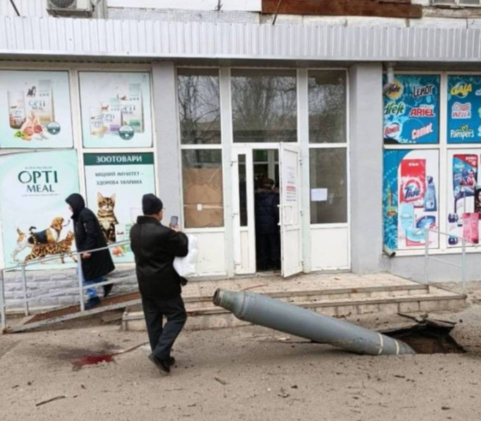 Part of a Russian rocket is seen in the street outside a shop in Kharkiv, eastern Ukraine, after bombardment by Russian forces