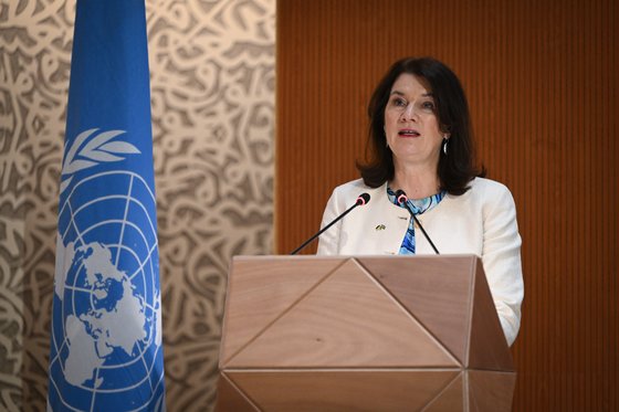 안 린데 스웨덴 외무장관이 지난달 28일 유엔 인권이사회 회의에서 연설하고 있다. [EPA=연합뉴스]