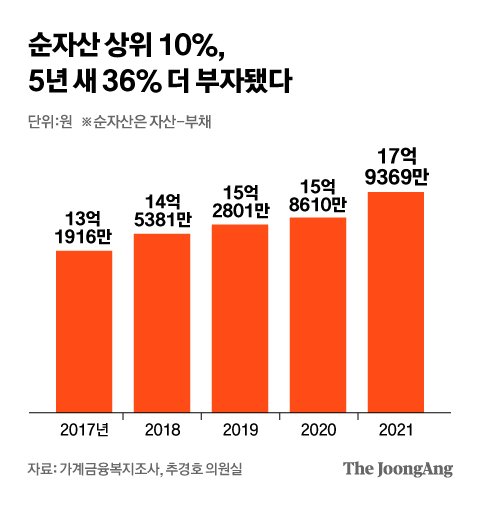 순자산 상위 10%, 5년 새 36% 더 부자됐다. 그래픽=차준홍 기자 cha.junhong@joongang.co.kr