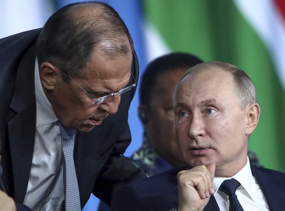 지난 2019년 세르게이 라브로프 러시아 외무장관과 이야기 중인 블라디미르 푸틴 대통령. AP=연합뉴스