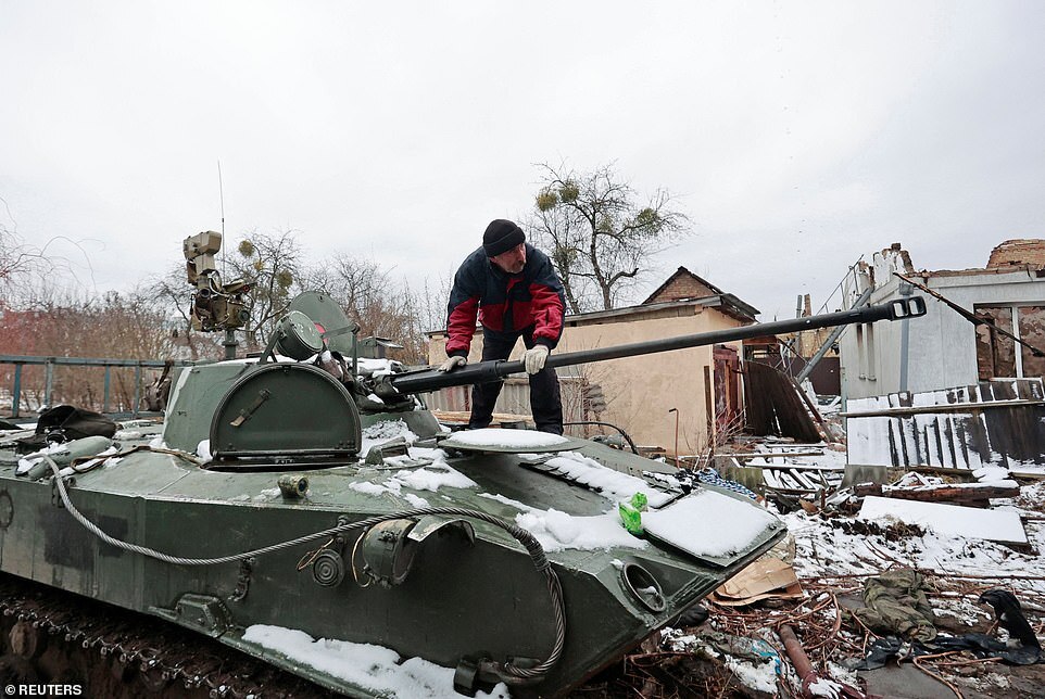 A local resident stands on a destroyed armoured vehicle, as Russia's invasion of Ukraine continues, in the town of Bucha