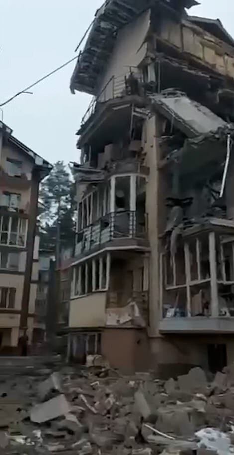 A destroyed apartment building in Irpin, a city on the outskirts of Kyiv, was struck by Russian missiles early on Wednesday