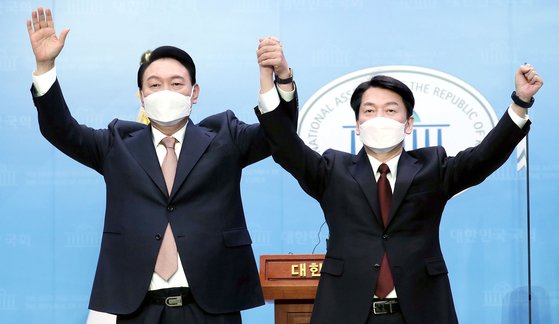 국민의힘 윤석열 대선 후보와 국민의당 안철수 대선 후보가 3일 오전 국회 소통관에서 단일화 기자회견을 마치고 포즈를 취하고 있다. 김상선 기자
