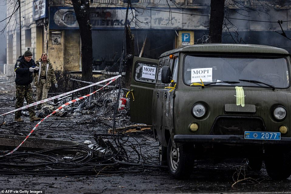 On Wednesday morning, the bodies of the five victims of a rocket strike on Kyiv's television tower were piled into a van and removed from the site by police - as the capital's mayor Vitali Klitschko warned that Russian forces were 'getting closer'.