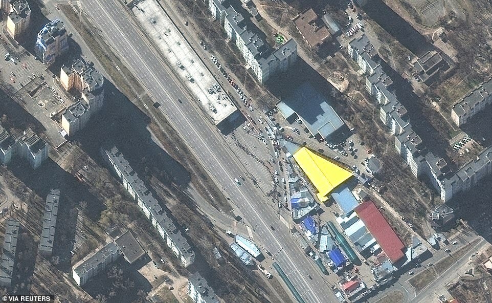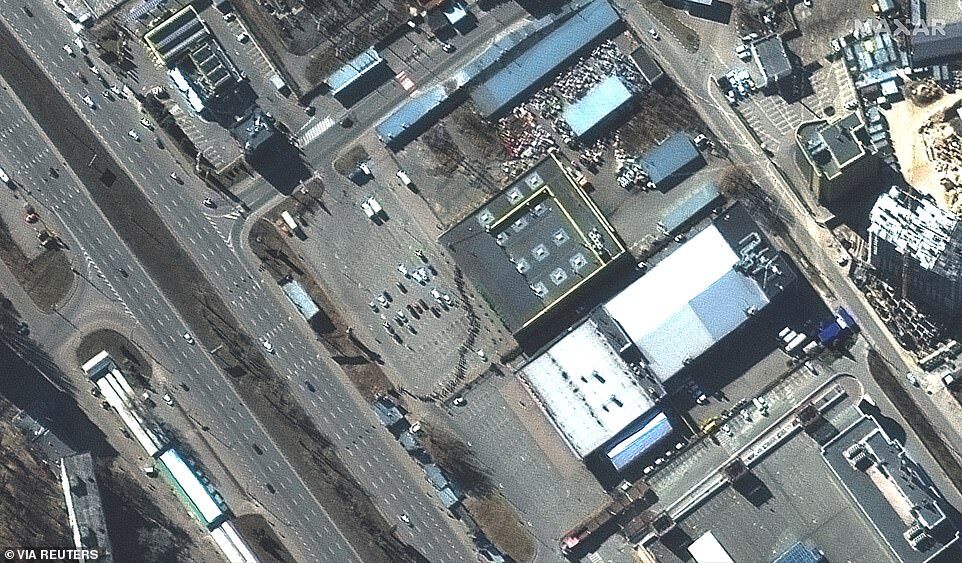 A satellite image shows a long line of people waiting for food outside a grocery store in Kyiv on Monday. The line can be seen snaking through the parking lot, next to the nearly-empty highway