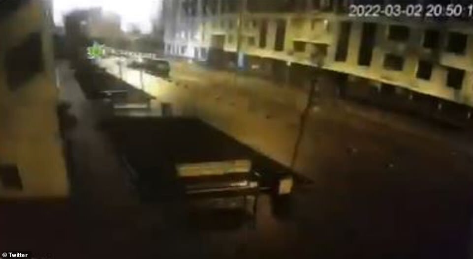 A Russian air strike hit near Kyiv's southern rail station on Wednesday where thousands of women and children are being evacuated, Ukraine's state-run railway company Ukrzaliznytsya said in a statement. Pictured: Footage purportedly showing a blast in Kyiv on Wednesday night near a southern train station and Ukraine's Ministry of Defense