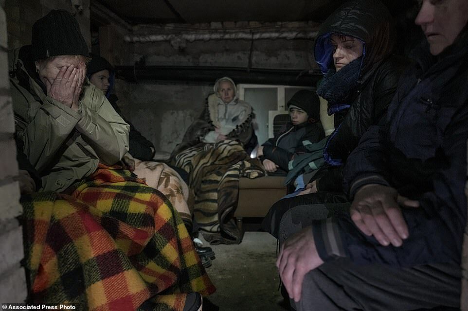 A woman cries in the small basement of a house crowded with people seeking shelter from Russian airstrikes, outside the capital Kyiv, on Wednesday