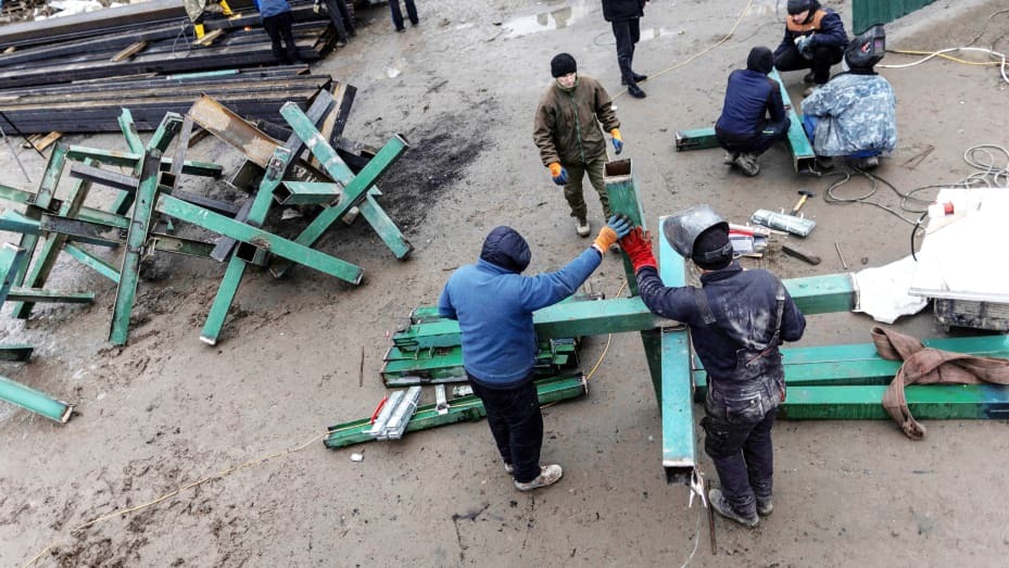 Workers in Kyiv and Lviv construct anti-tank barriers