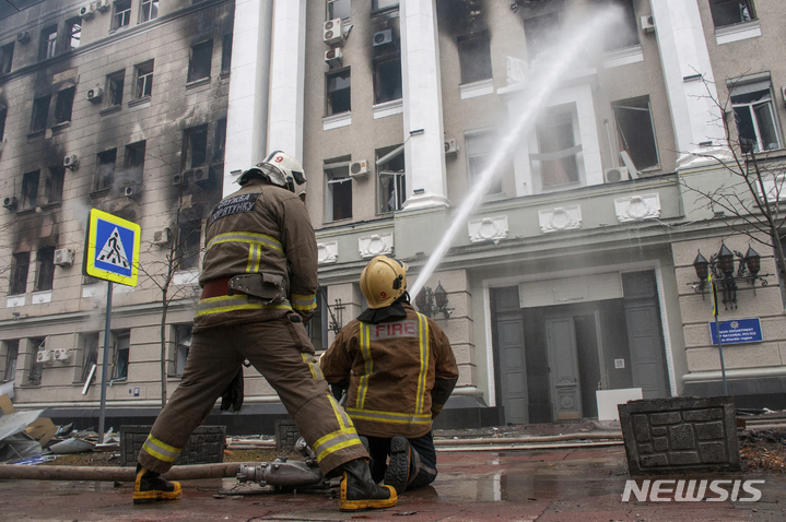 [하르키우=AP/뉴시스]3일(현지시간) 우크라이나 제2 도시 하르키우에서 소방관들이 러시아 공습을 받은 건물의 화재를 진압하고 있다. 2022.03.03.