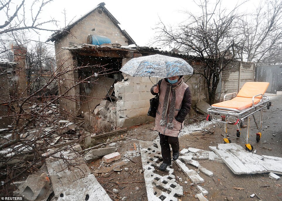 A woman walks next to a damaged house following recent shelling in the separatist-controlled city of Donetsk