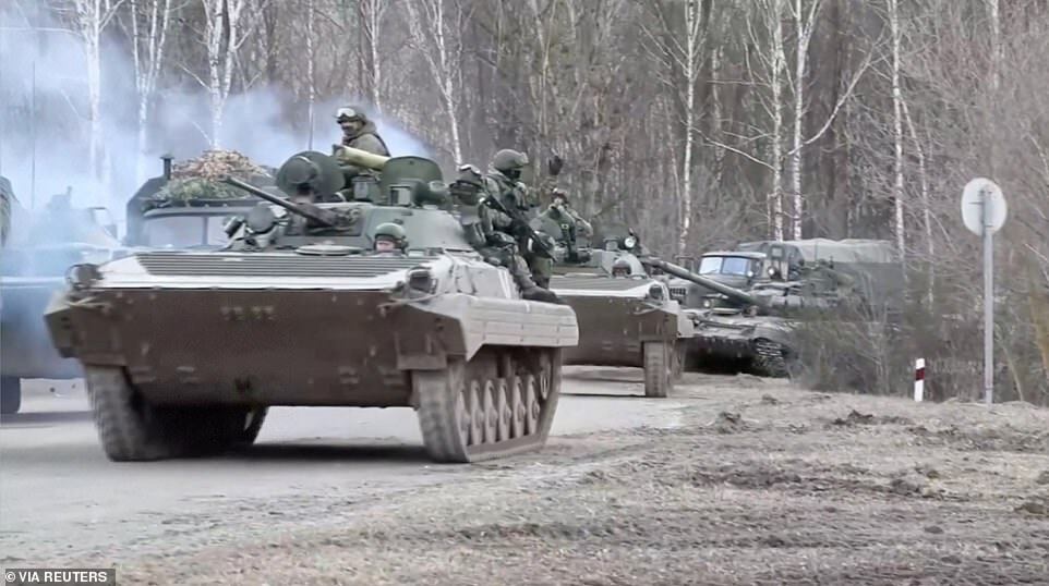 Units of Russian Armed Forces enter Kyiv region, Ukraine, in this screengrab obtained from a video by Reuters on Thursday