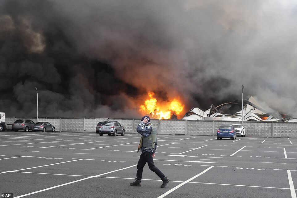 A Ukrainian serviceman walks past as fire and smoke rises over a damaged logistic center after shelling in Kyiv